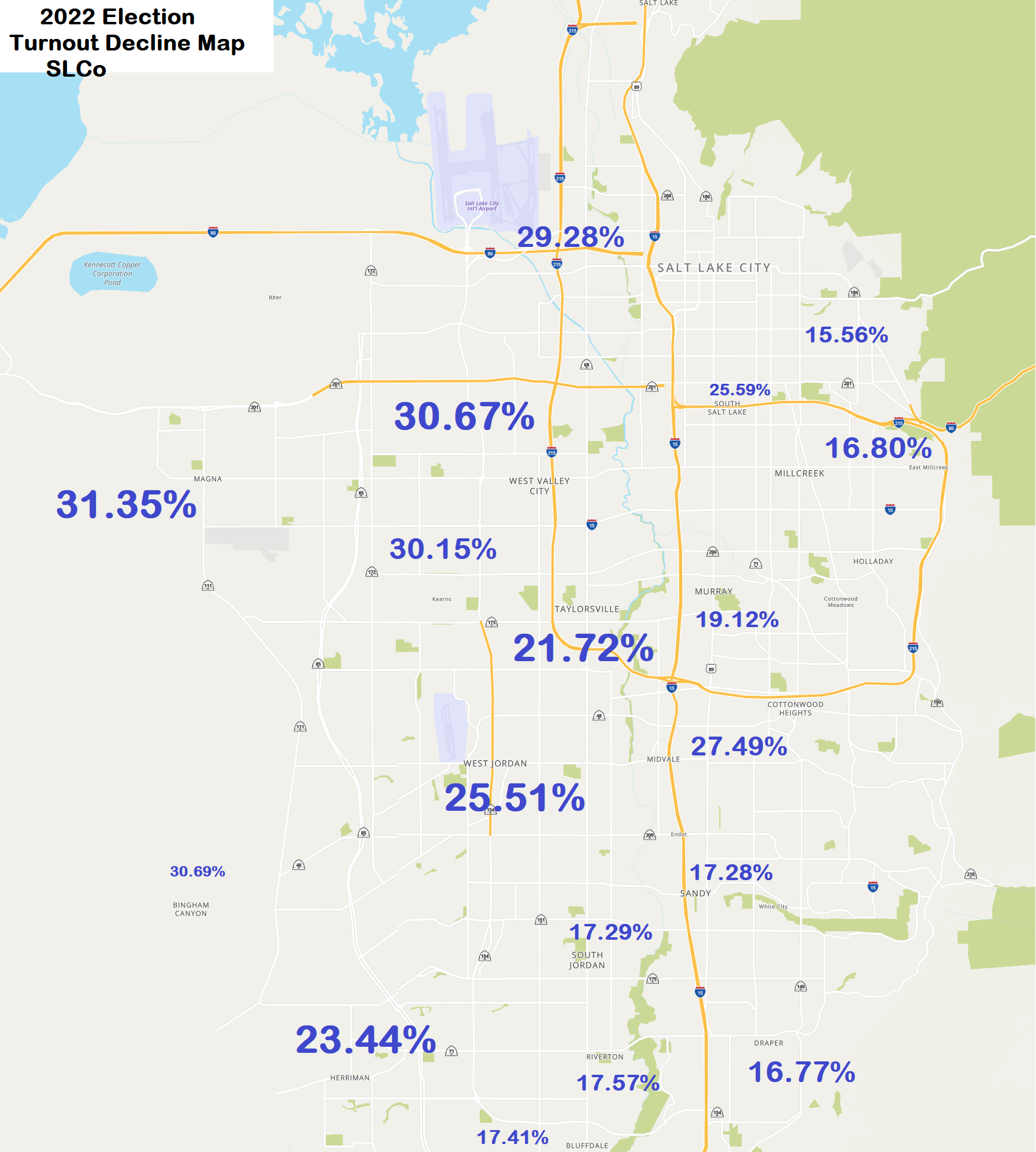 VotersMAG (Magna) 31.35% 11922 COP001 (Copperton) 30.69% 473 WVC (West Valley City) 30.67% 50247 KRN (Kearn) 30.15% 13524 SLC Westside (inc GSL) 29.28% 20185 MID (Midvale) 27.49% 15387 CBL (p/o Murray) 26.57% 329 SSL (South Salt Lake) 25.59% 10084 WJD (West Jordan) 25.51% 55461 WBN (Oquirrh?) 25.26% 1222 HER (Herriman) 23.44% 27019 WHT (White City) 21.93% 3074 SWT (w/o Herriman) 21.79% 645 TAY (Taylorsville) 21.72% 28794 SIL (p/o Sandy) 20.10% 220 LTC (Little Cottonwood) 19.32% 60 SHL (p/o Sandy) 19.24% 1251 MUR (Murray) 19.12% 28369 RIV (Riverton) 17.57% 25680 BLF (Bluffdale) 17.41% 9404 SJD (South Jordan) 17.29% 46826 SAN (Sandy) 17.28% 56265 MIL (Millcreek) 16.80% 35858 DRP (Draper) 16.77% 26129 WCR (Willow Creek) 16.29% 731 SLC Eastside (inc EMG PCN) 15.56% 78888 BRT (Brighton) 15.18% 370 HOL (Holladay) 14.00% 20579 COT (Cottonwood) 13.76% 21598 GNT (Granite) 13.75% 761 WCN (Willow Canyon) 13.41% 456 ALT001 (Alta Vista) 12.52% 188 SNB001 (Snowbird) (2018 only) 2022 % Decrease in Turnout County Map